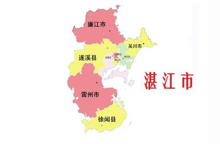 遂溪县,县政府驻遂城街道。位于湛江市域北部,县境东北与坡头区隔海湾相望,东南毗邻赤坎区、麻章区,南连雷州市,西滨临北部湾,北接廉江市。