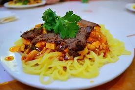 黄面是敦煌本地特有的一种面粉,经揉、撬、甩条等多道工序精心制作而成,因煮熟后略呈黄色,故名。