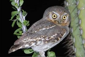 姬鸮又叫娇鸺(xiū)鹠(liú),个头小巧,体型和麻雀差不多,但眼睛却非常大,主要分布在北美西南部的沙漠地区,住在沙漠里的仙人掌上,或者啄木鸟啄出的树洞里,主要以夜间活动的昆虫喂食,比如蝎子。