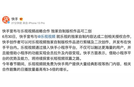 微博消息,6月30日,快手宣布与乐视视频就乐视的独家自制内容达成二创相关授权合作,快手创作者可以对乐视视频独家自制版权作品进行剪辑及二次创作,并发布在快手平台内。乐视视频通过接入快手小程序平台,不仅可以触达更海量的用户,并且能借助小程序的功能实现会员拉升及内容变现。快手方面表示,借助小程序平台的优势及能力,将持续探索长短视频双赢之路。