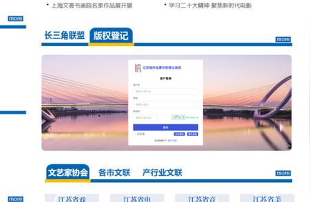 1.访问江苏文艺网(http://www.jswyw.com/),点击网站首页“版权登记”板块,访问“江苏省作品著作权登记系统”。