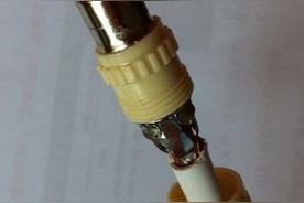 将接头的最下端套在有线电视线上,取出接头内的小铁环把有线电视线白皮内的屏蔽线包住